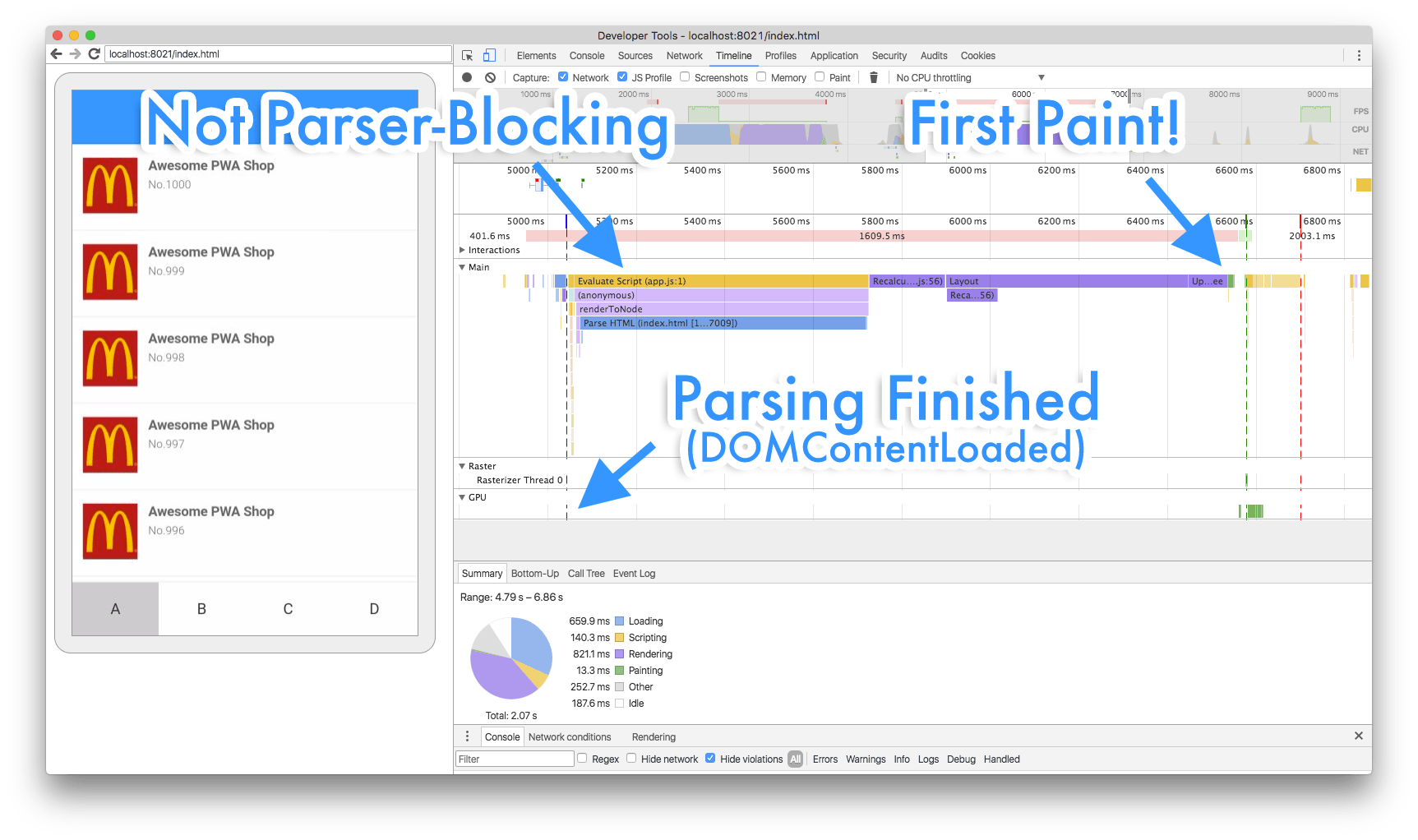 Then I want to say: A script not blocking parser could still block painting nonetheless. So here is a reduced test I wrote named “Minimal Multi-page PWA”, or MMPWA, which basically render 1000 list items within an async (and truly not parser-blocking) script to see if we can get Skeleton Screen painted before scripts get executed. The profile below (over USB debugging on my real Nexus 5) shows my ignorance: